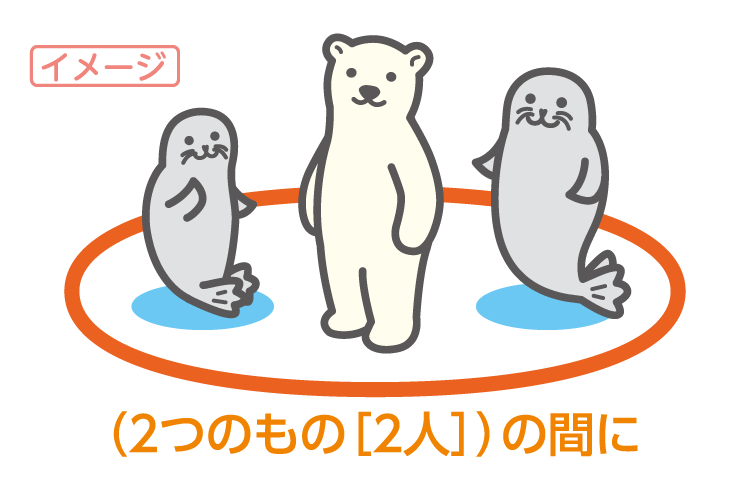 ~の間に, ~の間の, ~の間で(の) ⦣ 2つのもの[2人]の間についていう.