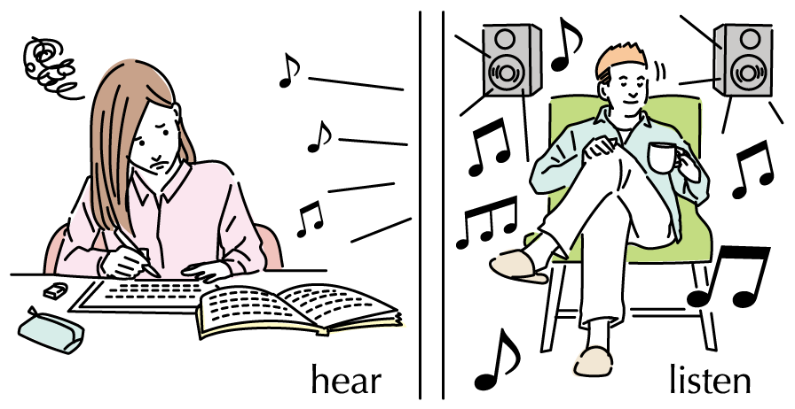 hear は「聞こえる」という状態を表す語なので, ふつう進行形 (be hearing) にしない.