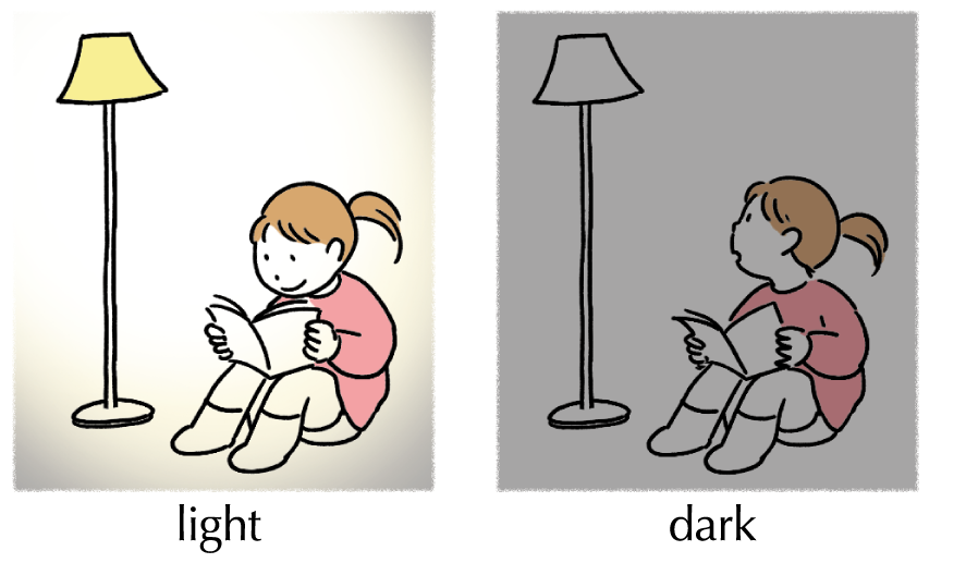と「明暗」を表す. この形ではふつう「部屋, 家」などは主語にしない.