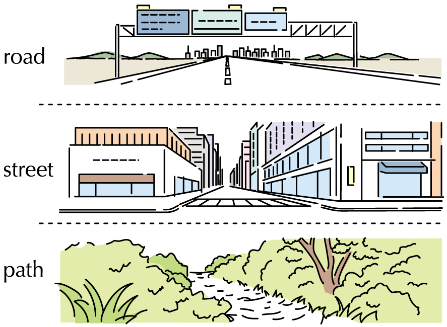 road は車が行き来できる程度に広い道で, ある地域とある地域を結ぶもの. street は片側あるいは両側に建物の並んだ街中まちなかの通り. path は森の中の小道や公園の歩道.