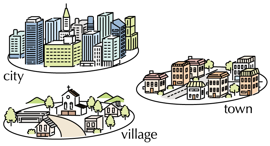 ⦣ 実際には市 (city) でも, (特にそこに住む人は)ふだんの会話では town と呼ぶことが多い.